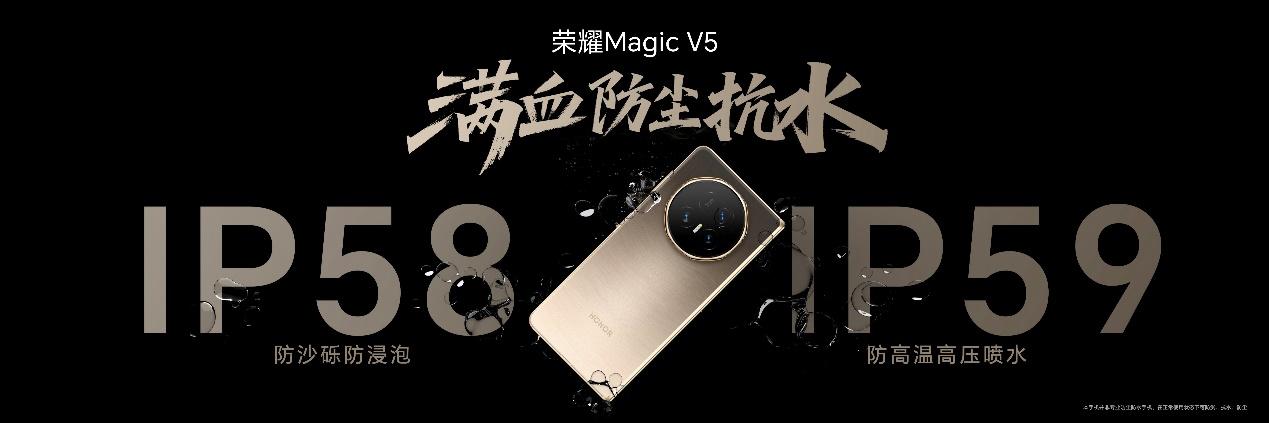 在可靠性方面,荣耀MagicV5搭载新一代金刚巨犀玻璃,防摔、防磨、防刮;满血防尘抗水,全系支持IP58和IP59。
