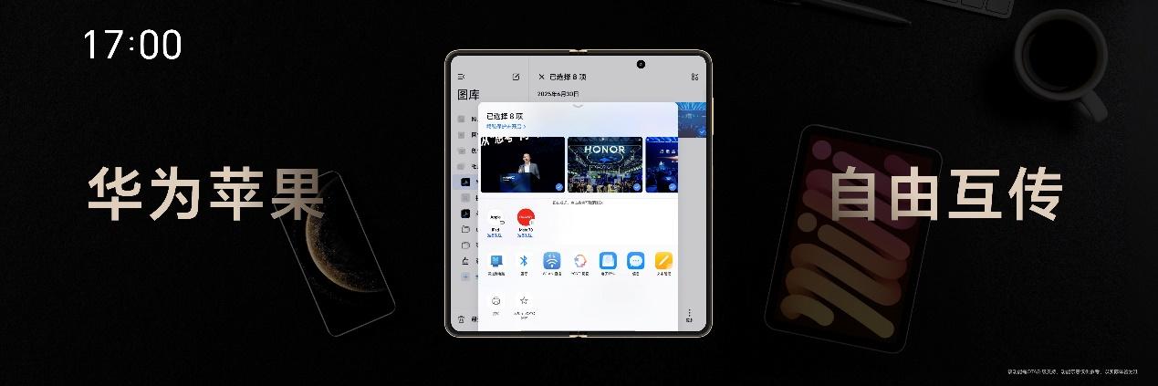 荣耀MagicV5以全生态设备互通互联技术,突破智能终端壁垒。Android、苹果、Windows,荣耀MagicV5均可无缝连接,首次实现全品牌手机、PC、平板、手表、耳机设备的文件互传、数据同步与跨端协作等高效联动,“谁都能连,传啥都快”,开启万物互联AI新体验。