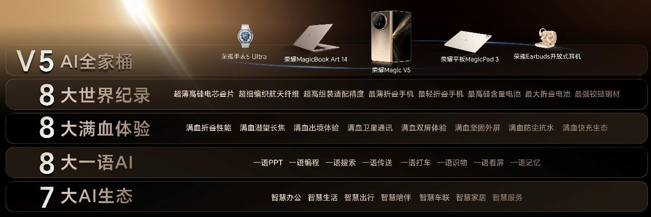 2025年7月2日,全球领先的AI终端生态公司荣耀(HONOR)在深圳举办新品发布会,备受期待的轻薄折叠旗舰新品——荣耀MagicV5惊艳亮相。荣耀MagicV5以突破性的制造工艺和技术创新、全面满血的旗舰性能配置,以及AI智能体的多功能应用、多生态覆盖,重新定义折叠旗舰标准,实现八大“世界纪录”、八大满血体验、八大一语AI、七大AI生态,带来前所未有的“V587”折叠旗舰新体验。