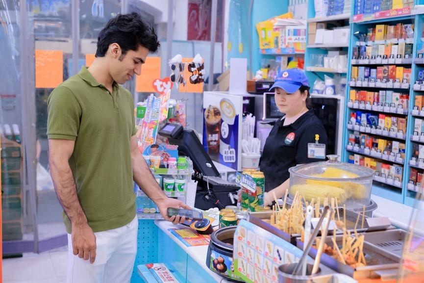 图:外国友人在友客便利店使用“支付宝碰一下”支付