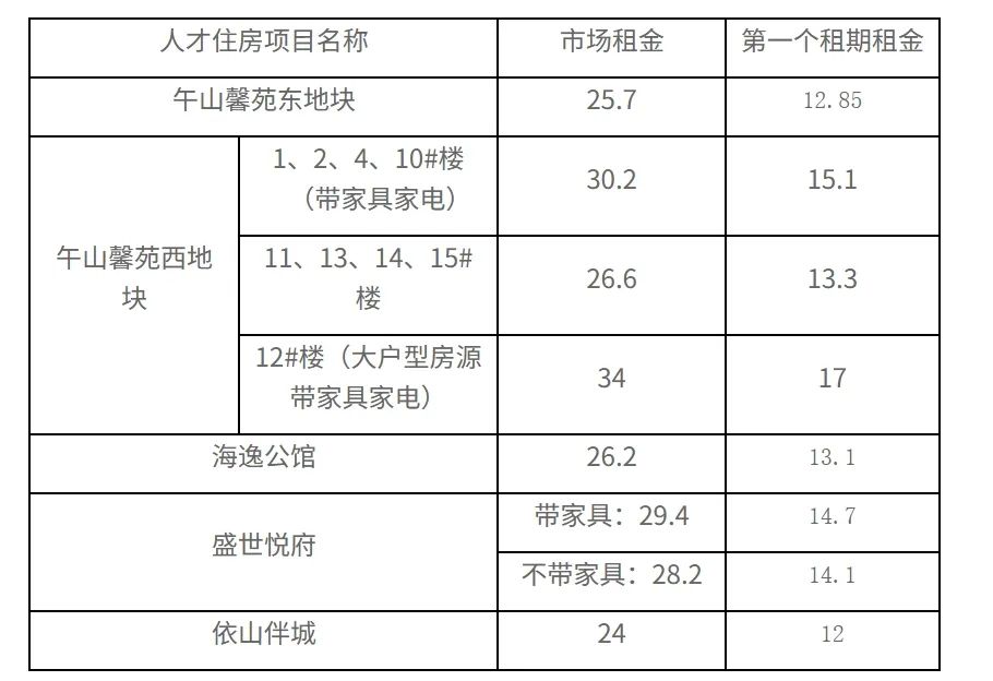 租赁型人才住房每3年一个租期,承租人自首次承租之日起3年内,享受人才住房优惠面积标准内的,按市场租金50%的标准收取;超出人才应享受住房优惠面积标准50%以内的,仍按市场租金50%的标准收取;第二个租期(第4-6年)优惠租金按照不高于市场租金标准的80%确定。超出上述建筑面积的部分,按市场租金收取。租金收费标准如下(元/月·㎡):