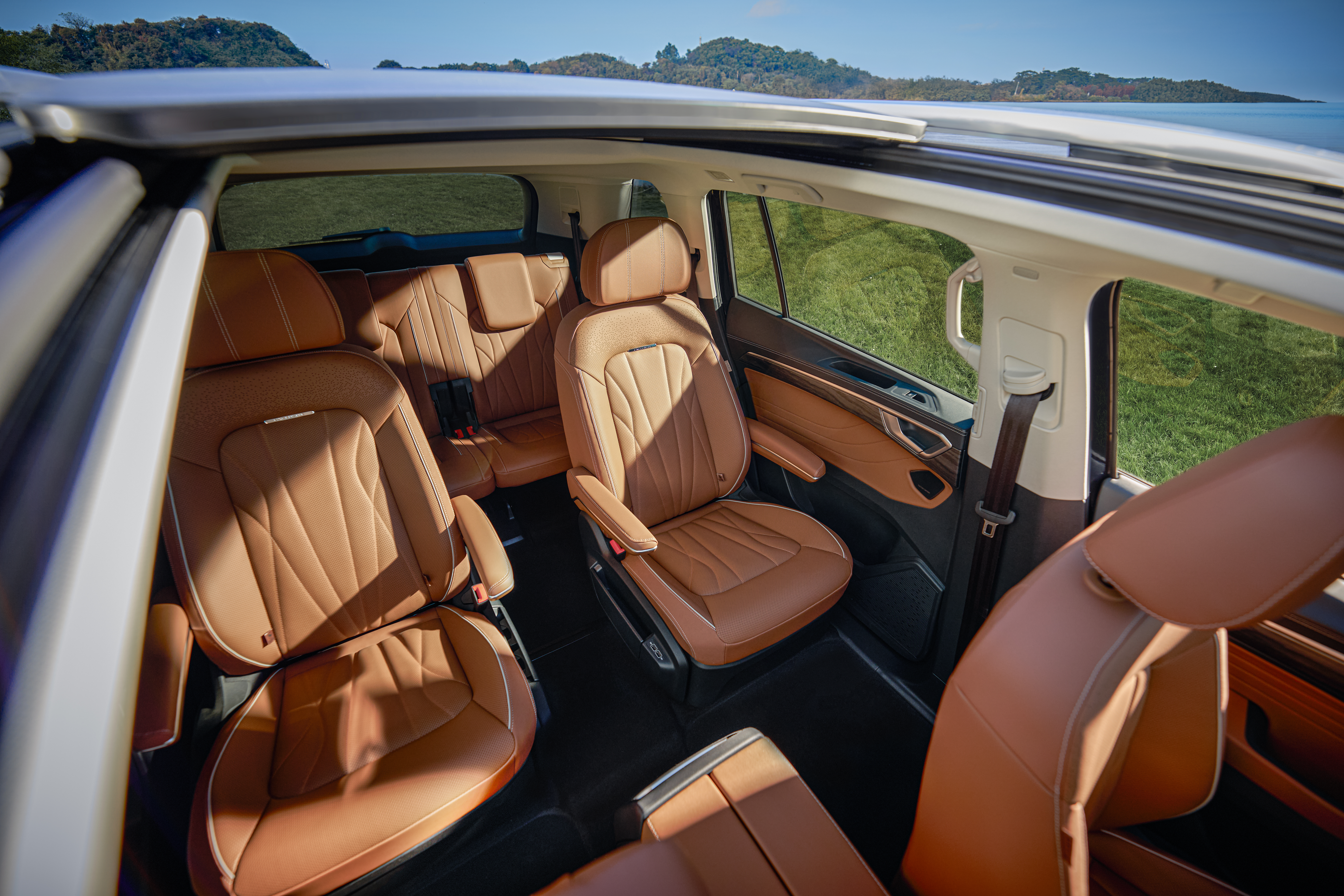 同时,为满足不同家庭结构所需,全新揽境配备了6座与7座两种座椅布局。6座版堪称家庭专属舒享陆地头等舱,二排独立座椅除配备电动调节、通风、加热等功能外,还内置3D按摩气袋,可模拟真人按摩手法环绕揉捏,有效舒缓腰背疲劳,配合230 mm行业TOP级的宽敞中央通道,三排进出更从容。7座版本格局多变,通过二、三排座椅的随需放倒,可拓展出进深超过2.2 m的“纯平”空间,轻松容纳婴儿车、露营装备等大件物品,周末全家出游满员的情况下,后备厢容积仍有350L,是同级别唯一可以同时放下2个24寸和2个20寸行李箱的车型。