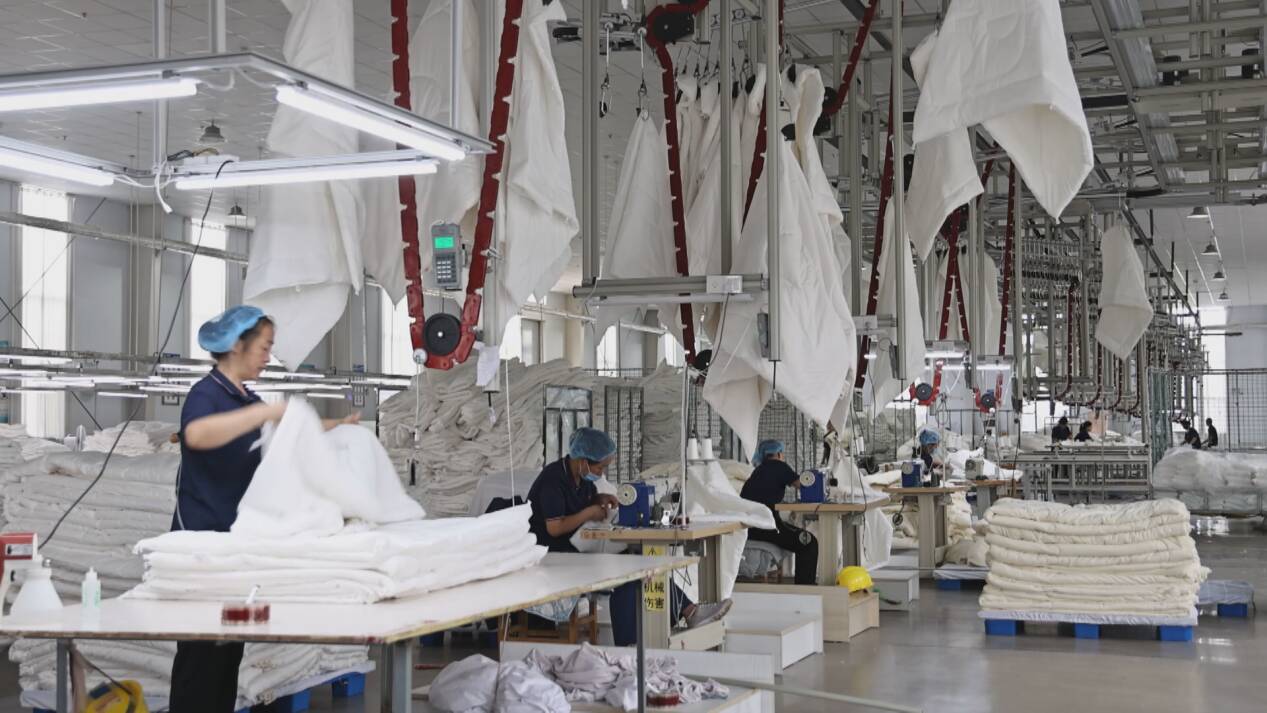而博物馆外的现实图景,正书写着纺织产业的新传奇。在山东鑫瑞娜家纺股份有限公司现代化的纺织园区内,智能化吊挂流水线高速运转,依托自主研发的3S纯棉舒化技术及省级智能制造场景认证,实现了“原料-半成品-成品”的全流程数字化管控,300余台套先进设备,覆盖棉花梳理、铺网、装套、绗缝、检针、灭菌等全流程,支持年产可达100万套中高端纯棉床品的高效生产。