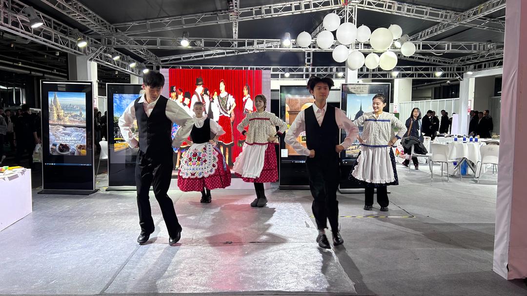 在今年新设的魅力友城专区,德州与匈牙利皇宫堡的展台前,一段欢快的马扎尔舞蹈引来阵阵掌声。跳舞的是矫超的妻子和女儿等人,2015年移居匈牙利的矫超,如今是中东欧中国科技交流协会会长。