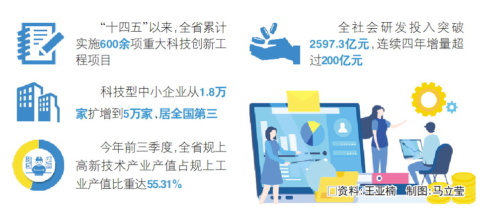 作为科技创新的主力军,全省科技型企业数量和质量实现“双提升”。科技型中小企业从1.8万家扩增到5万家、居全国第三,较“十三五”末增长175%;高新技术企业从1.4万家跃升到3.5万家、居全国第四,较“十三五”末增长150%。今年前三季度,全省规上高新技术产业产值占规上工业产值比重达到55.31%,超出“十四五”规划目标5.31个百分点,较“十三五”末提高10.21个百分点。
