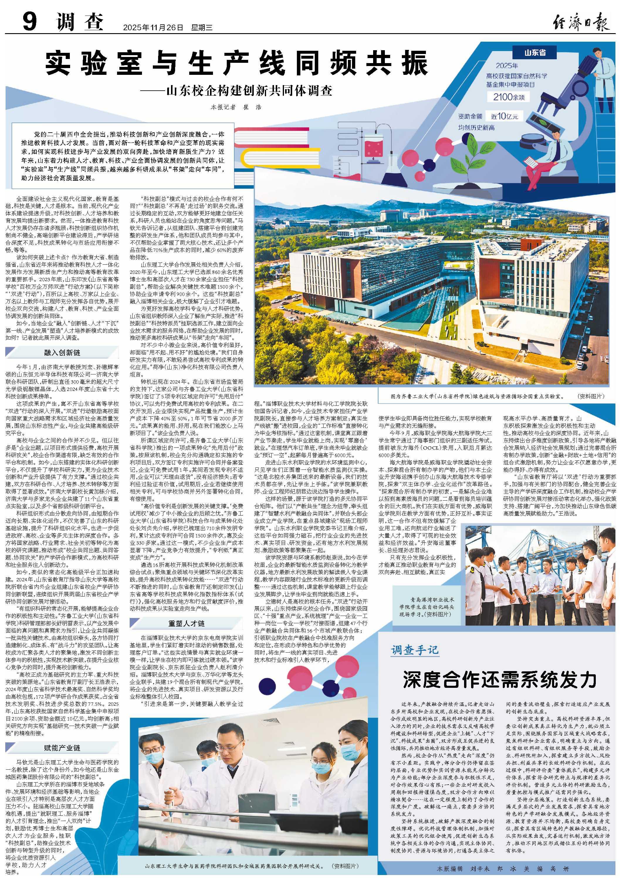 党的二十届四中全会提出,推动科技创新和产业创新深度融合,一体推进教育科技人才发展。当前,面对新一轮科技革命和产业变革的现实需求,如何实现科技进步与产业发展的双向奔赴,加快培育新质生产力?近年来,山东着力构建人才、教育、科技、产业全面协调发展的创新共同体,让“实验室”与“生产线”同频共振,越来越多科研成果从“书架”走向“车间”,助力经济社会高质量发展。