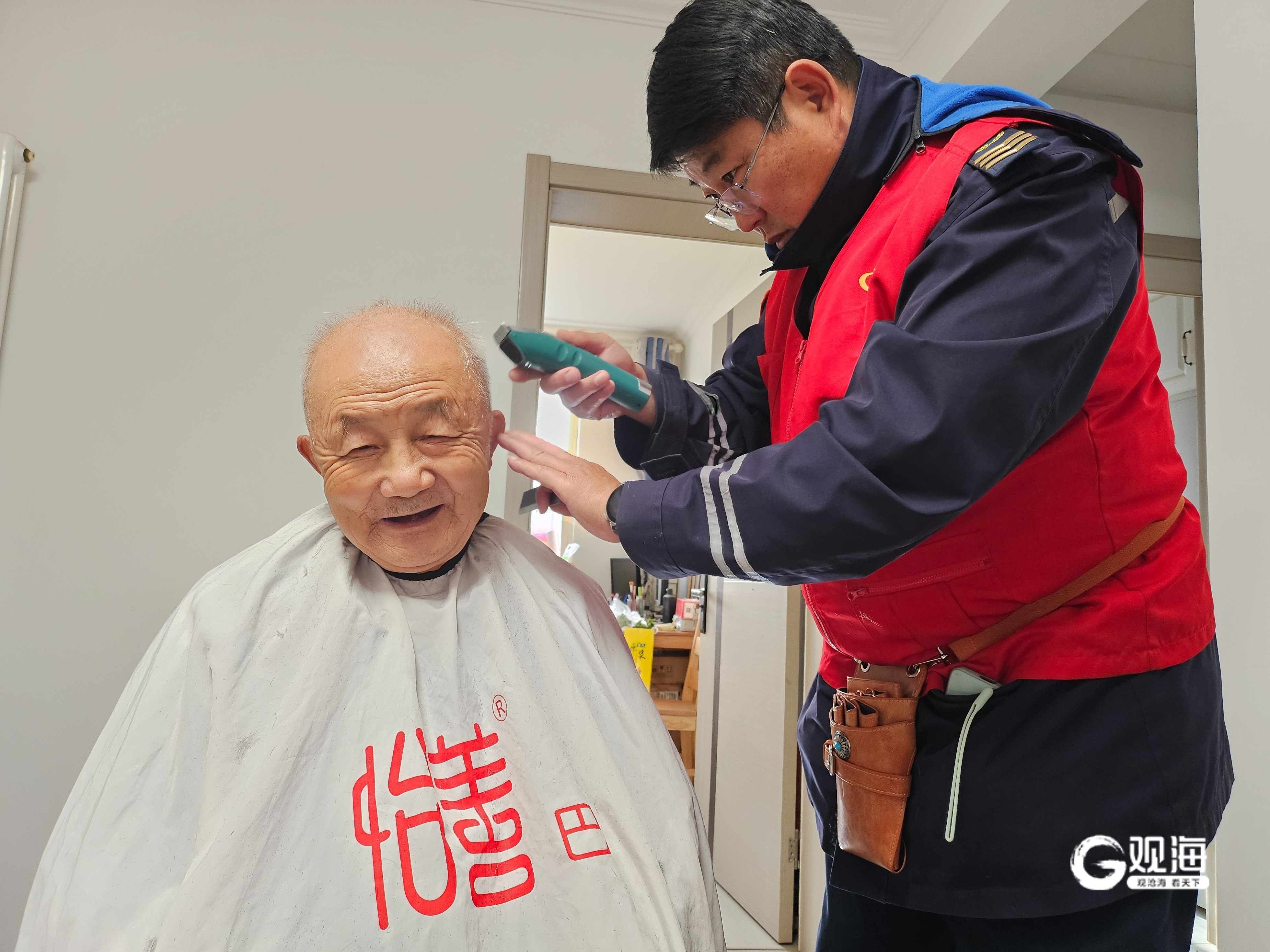 在85岁的抗美援越老兵王京刚大爷家中,志愿者为老人理发,听老人讲述当年的战斗故事,帮老人擦拭奖章、整理老照片,让老人感受到浓浓的关怀。