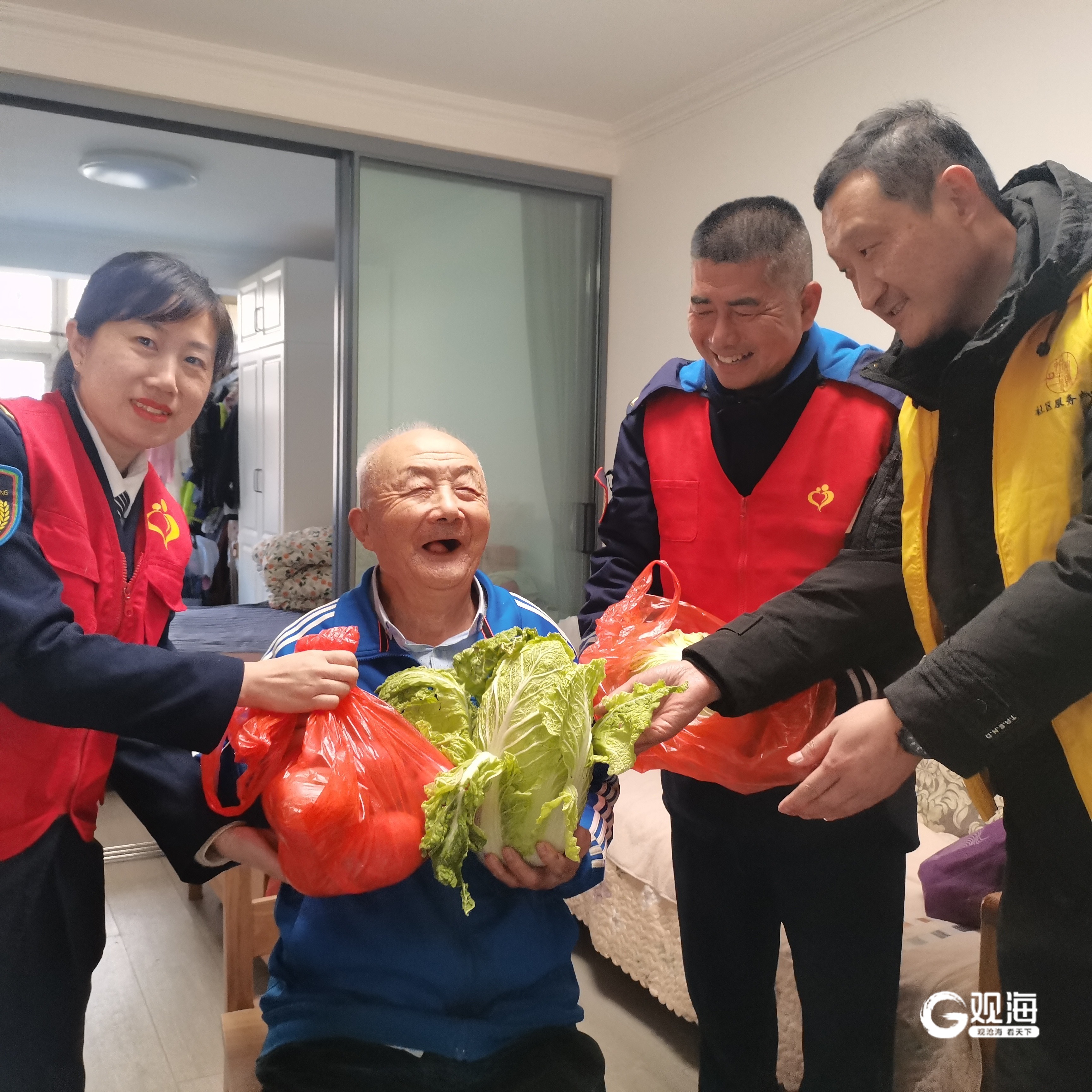当日,公交集团崂山巴士第六分公司志愿服务团队的李嘉林、丁晓、林先晓、徐蕾和刘君峰五位志愿者还带着苹果和悦纳天赐社区服务中心捐赠的大白菜,来到三位老人家中开展爱心陪伴活动。
