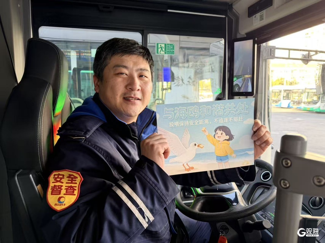 除了栈桥上的志愿服务,2路公交驾驶员刘文昊还将文明赏鸥的理念延伸到了自己的车厢内。近日,他精心打造的“赏鸥主题车厢”正式上线,让公交车变成了流动的文明宣传站。
