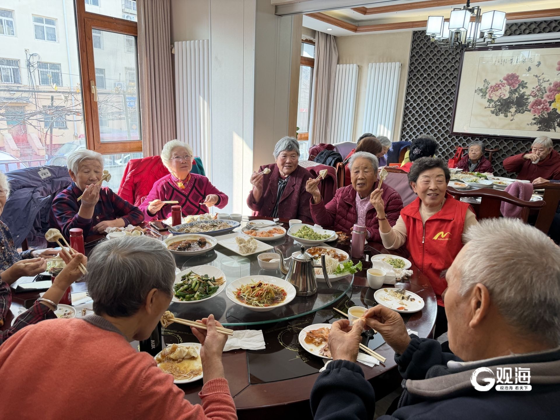 为了这场一年一度的盛宴,谭洪声夫妇提前数日便开始筹备。“今天到场的大约120个人,我们包了4000个饺子,200来份,都是提前准备好的。”老板娘谭凤华说。从选材、调馅到包制,每一个环节都凝聚着夫妇俩的心意。除了主角饺子,餐桌上还摆满了大虾、肘子、鱼和各色凉菜,荤素搭配,营养均衡。上午11:30,随着工作人员一声“吃饺子啦!”,热气腾腾的饺子被端上桌,老人们和环卫工人们围坐在一起,边吃边聊,欢声笑语不断,温馨融洽的氛围驱散了冬日的寒冷。