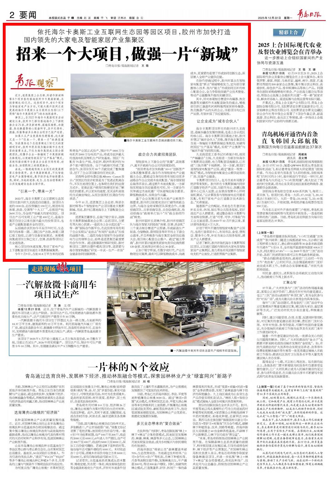 记者了解到,胶州市依托海尔卡奥斯等园区项目,正加速打造国内领先的大家电及智能家居产业集聚区,助力青岛市巩固提升智能家电支柱产业地位,打造世界级产业集群。(青岛日报/观海新闻记者 王萌)
