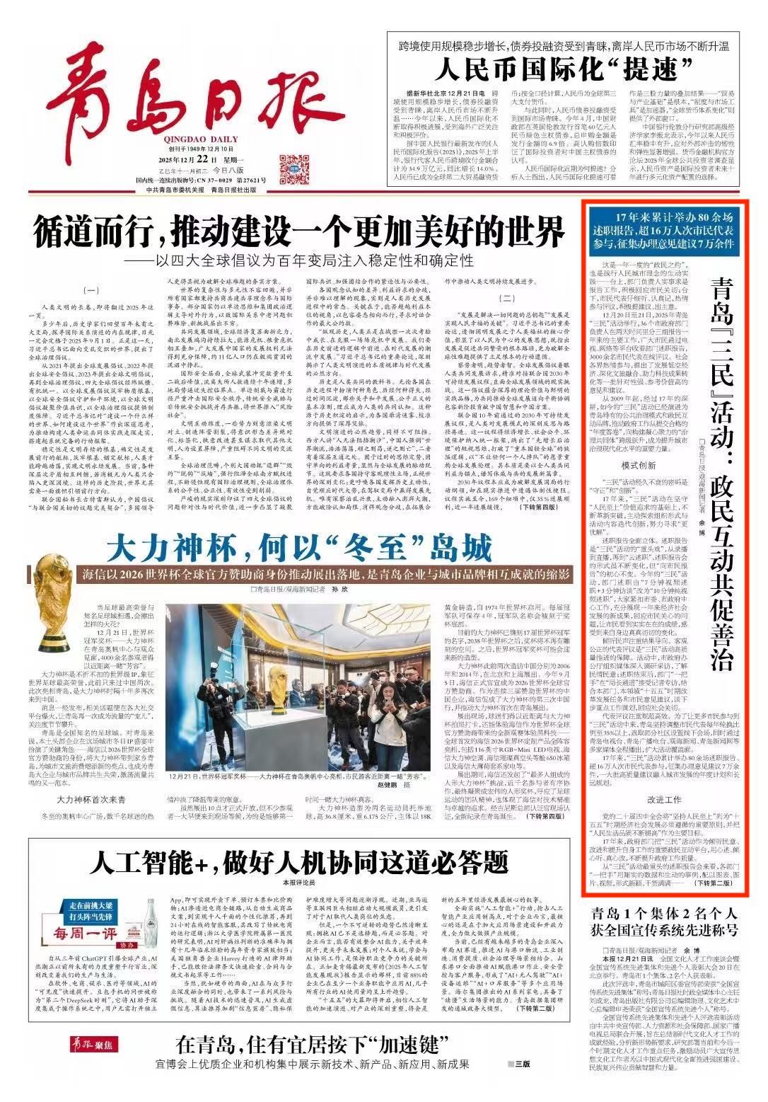 从2009年起,经过17年的深耕,如今的“三民”活动已经演进为青岛特有的公共治理模式和政民互动品牌,推动政府工作从提交合格的“年度答卷”,向构建凝心聚力的“治理共同体”跨级跃升,成为提升城市治理现代化水平的重要力量。