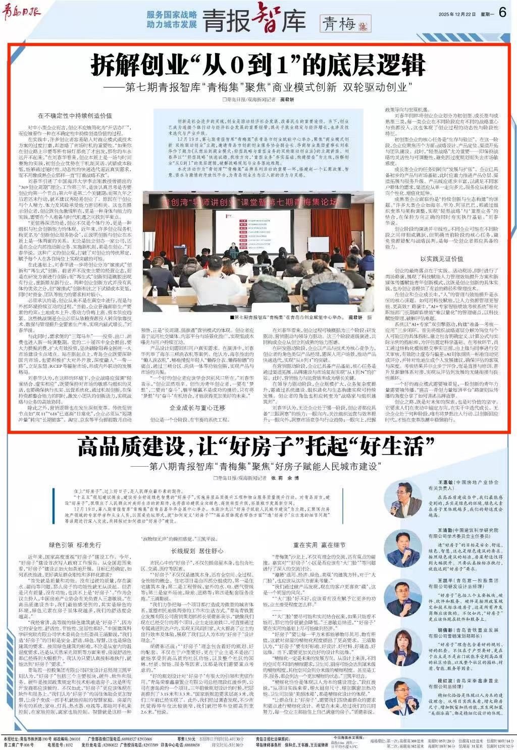 12月19日,第七期青报智库“青梅集”在青岛市创业赋能中心举办,聚焦“商业模式创新 双轮驱动创业”主题,邀请青岛市创新创业服务协会副会长、华商智业集团董事长刘春华作了题为《从想法到商业模式:轻型战略与重型业务的双轮驱动创业法》的主题讲座。刘春华以“‘轻型战略’快速试错、找准方向,‘重型业务’夯实基础、构建壁垒”为主线,拆解创业“从0到1”的底层逻辑,破解战略规划与业务落地难题。