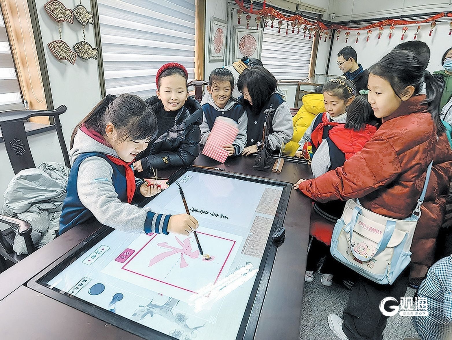 孩子们在青岛市文化馆通过数字体验机学习书法。王雷 摄