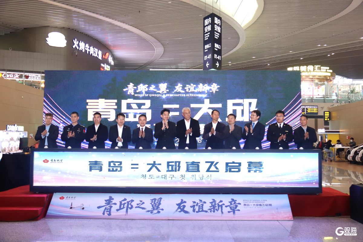 青岛日报社/观海新闻12月22日讯 12月21日,在韩国驻青岛总领事馆、民航青岛监管局、市委外办、市交通运输局、市文旅局、青岛机场集团等政府及驻场单位的共同见证下,青岛城投集团旗下青岛航空青岛=大邱国际直飞航线正式开通,这是目前山东省内首条直飞大邱的航线,也是继青岛=首尔、青岛=济州后青岛航空在韩国布局的第3条重要航线,标志着青岛航空东北亚航网拓展再进一步。