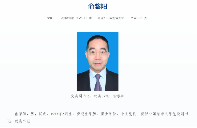 据中国海洋大学官网12月16日更新的俞黎阳简历页面显示,俞黎阳,男,汉族,1975年6月生,研究生学历,博士学位,中共党员。现任中国海洋大学党委副书记、纪委书记。