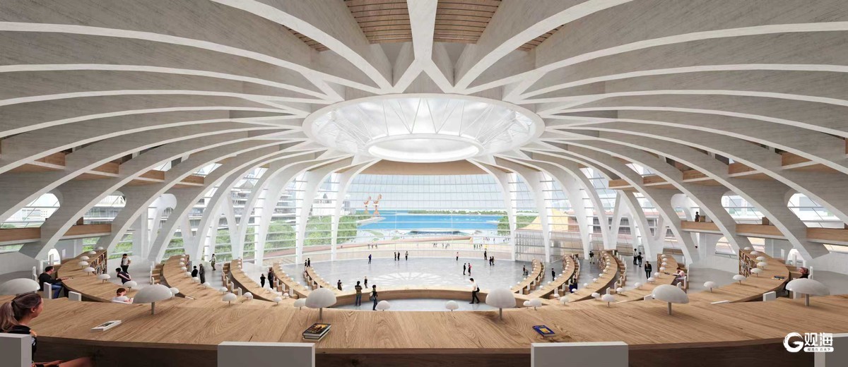 作为承载城市文化根脉的重要载体,新馆在设计上独具匠心,充分利用面朝大海、背靠老城的区位优势,采用“书页”状立柱穿插玻璃幕墙的外观设计手法,为市民呈现出碧波辉映、书香致远的美好画面,将成为青岛城市文化形象展示新窗口。在功能上,以建设国际一流的现代图书馆为核心目标,着力打造集“阅读文化中心、知识交流中心、决策咨询智库、文化体验空间、国际交流平台”等五大功能于一体的全媒体时代的智慧复合型图书馆,为市民提供一处集阅读、学习、交流、休闲于一体的公共文化新空间。在空间布局上,项目采用“1+8”模式,由图书馆区(A区)1个核心单体与环绕其周边的商业配套区(B-J区)8个单体共同构成,形成文化服务与商业消费有机融合的复合型空间体系。