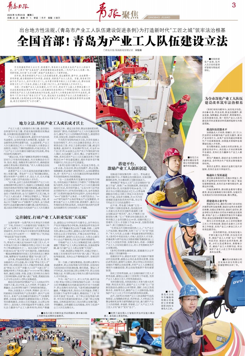 出台地方性法规,《青岛市产业工人队伍建设促进条例》为打造新时代“工匠之城”筑牢法治根基