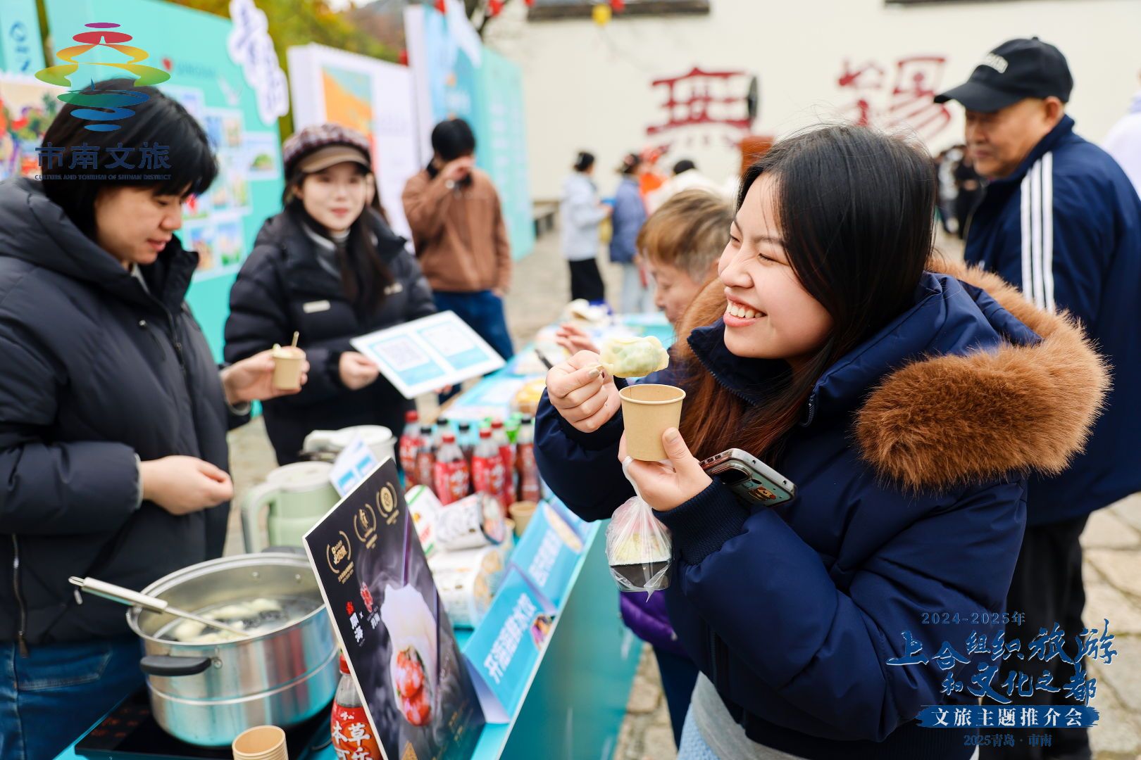 舌尖先行,品尝海的鲜美。现场弥漫着地道的青岛风味。从“开海”的海鲜水饺、麻辣小海鲜,到非遗技艺的吕氏速食疙瘩汤,再到陪伴一代代人成长的青食钙奶饼干与独特滋味的崂山可乐等经典青岛味道,成为了最亲切的文旅大使。