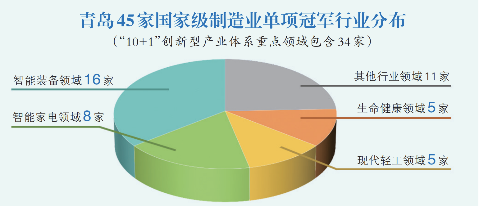 行业分布上,青岛国家级制造业单项冠军企业主要分布于“10+1”创新型产业体系的重点领域。其中,智能装备领域16家、智能家电领域8家、现代轻工领域5家、生命健康领域5家。