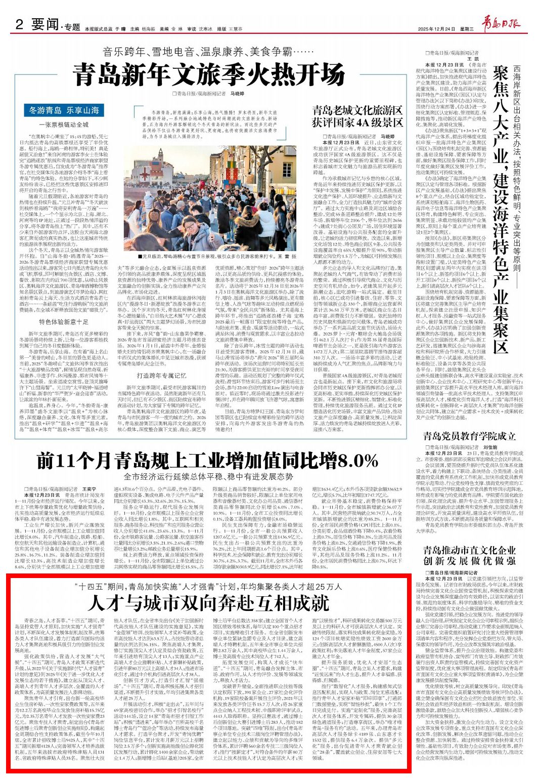 “十四五”期间,青岛加快实施“人才强青”计划,年均集聚各类人才超25万人