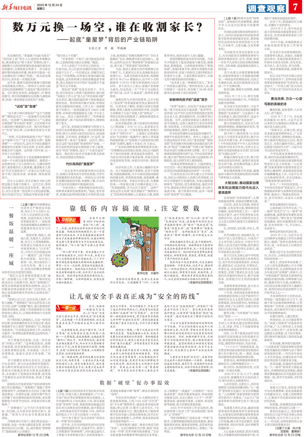 “星梦”虽诱人,但灰色产业链必须铲除。“孩子的成长经不起试错。”张萍呼吁,监管部门应严厉打击没有资质的演艺机构及从业人员,整治虚假宣传、合同欺诈等行业乱象。另外,还要加快制定儿童演艺行业专项规范,完善儿童演艺行业在培训收费、培训质量、工作时间以及保障措施等方面的标准规范,保障儿童权益。