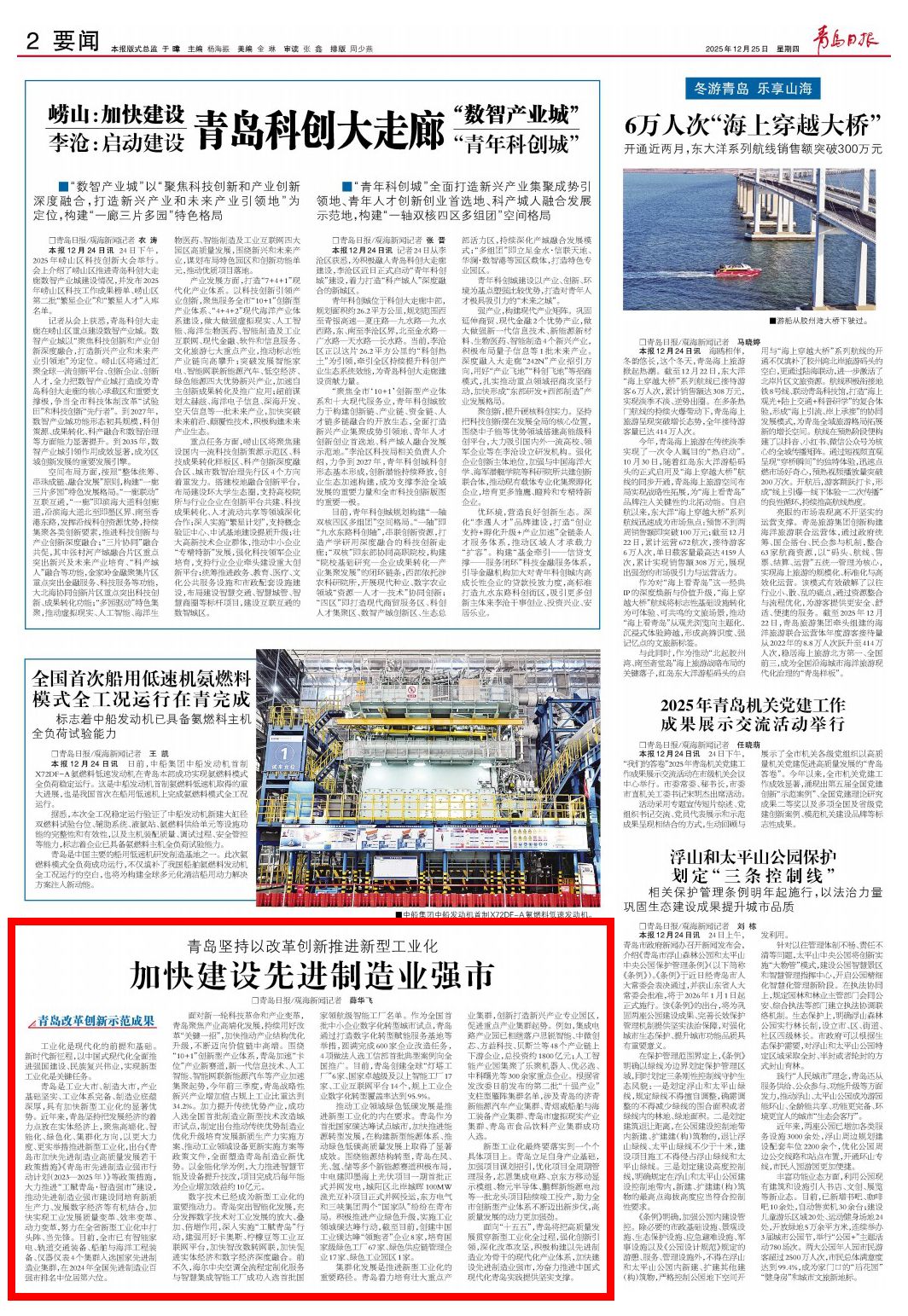 面向“十五五”,青岛将把高质量发展贯穿新型工业化全过程,强化创新引领,深化改革攻坚,积极构建以先进制造业为骨干的现代化产业体系,加快建设先进制造业强市,为奋力推进中国式现代化青岛实践提供坚实支撑。(青岛日报/观海新闻记者 薛华飞)