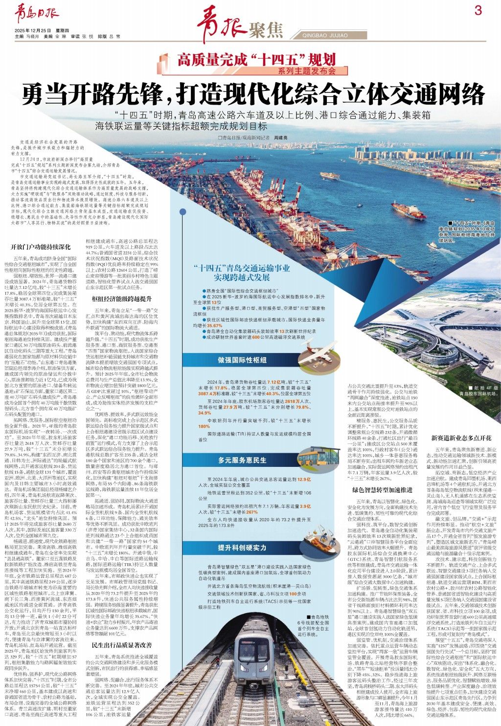 市交通运输局党组书记、局长路玉军介绍,“十四五”时期,是青岛交通运输事业实现跨越式发展、取得历史性成就的五年。五年来,青岛坚持将构建现代化综合交通运输体系作为高质量发展的战略支撑,大力实施“硬联通”与“软服务”双轮驱动战略,通过制度、科技与服务创新,推动客流高效品质出行和物流降本提质增效。高速公路六车道及以上比例、港口综合通过能力、集装箱海铁联运量等关键指标超额完成规划目标,现代化综合立体交通网络主骨架基本成型,交通运输在促投资、稳增长、惠民生中的基础性、先导性作用充分彰显,青岛建设现代化国际大都市“人享其行、物畅其流”的美好图景日益清晰。