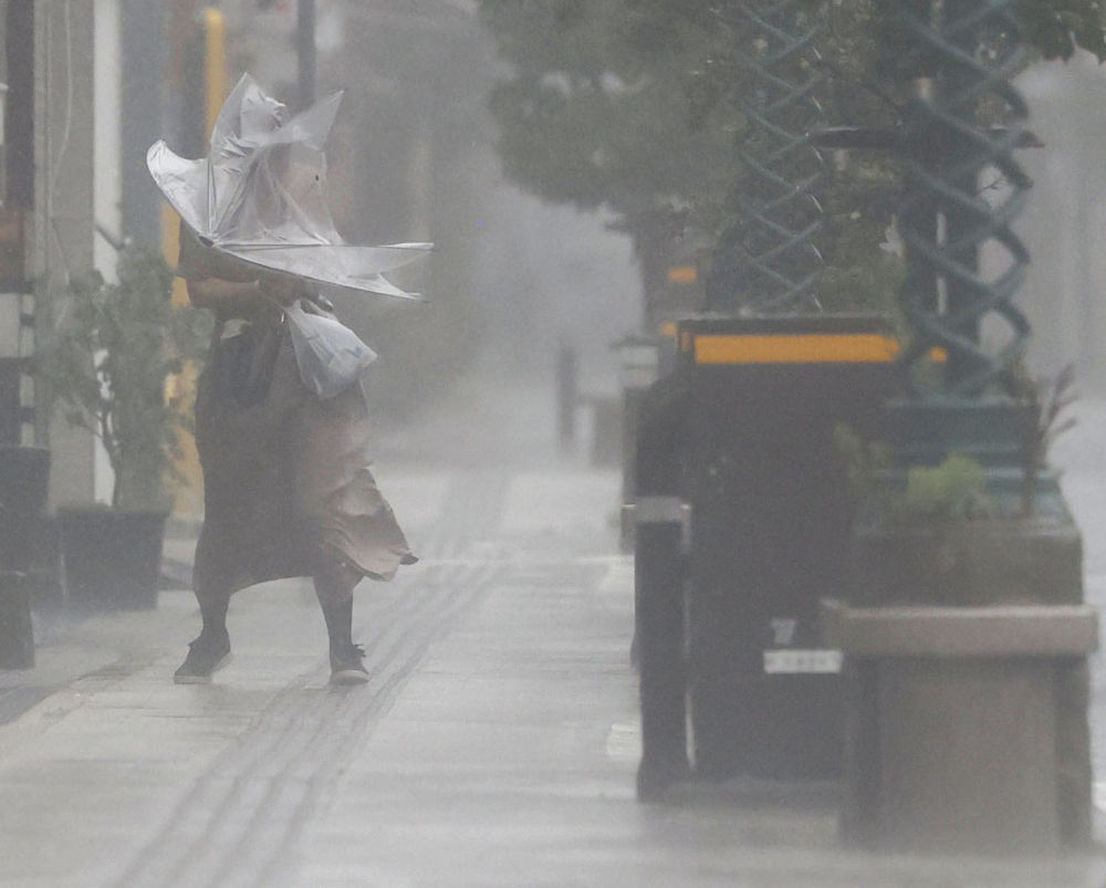 2022年9月18日,行人在日本宫崎县宫崎市街头冒雨前行。新华社/共同社