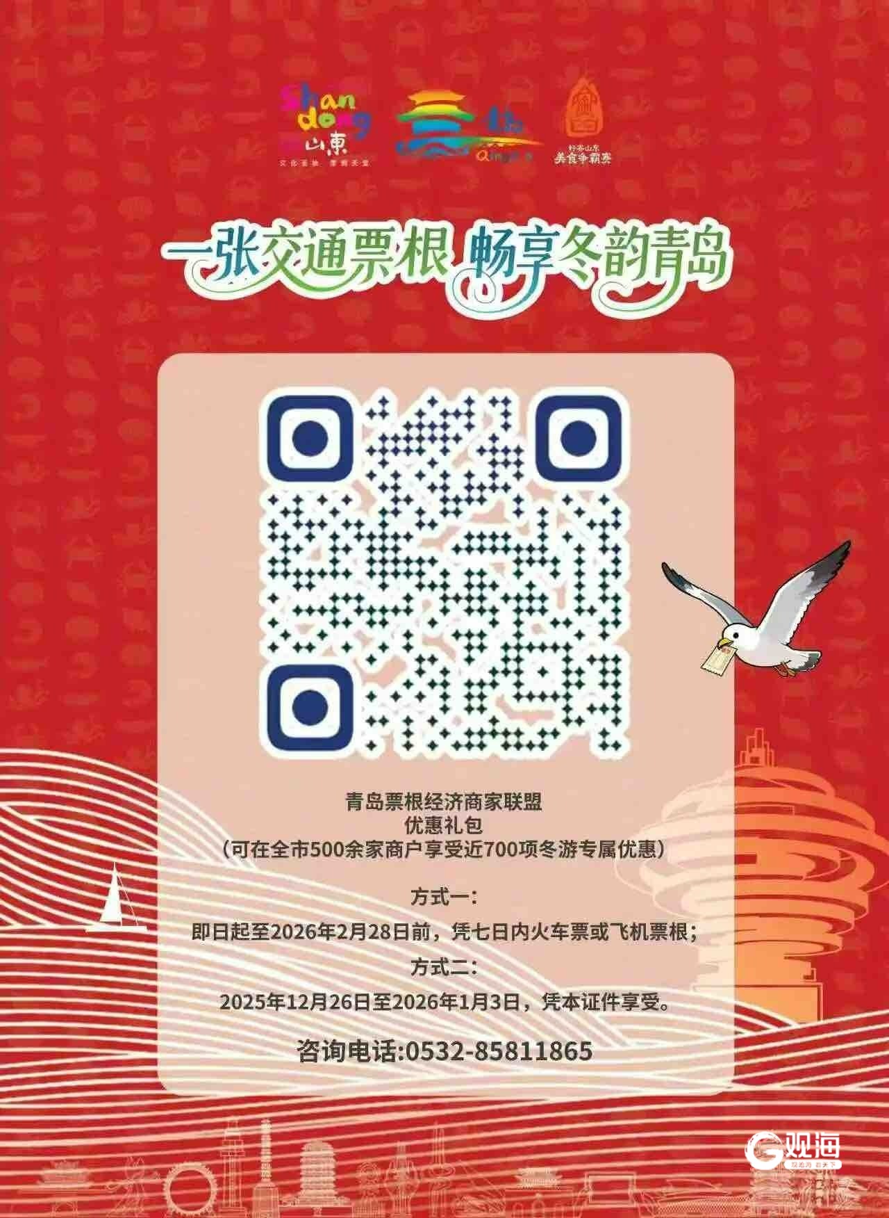 福利二:游客通用优惠。即日起至2026年2月28日前,凭七日内火车票或飞机票根,就能在全市500余家商户享受近700项冬游专属优惠,相当于一张交通票根解锁整个冬韵青岛!