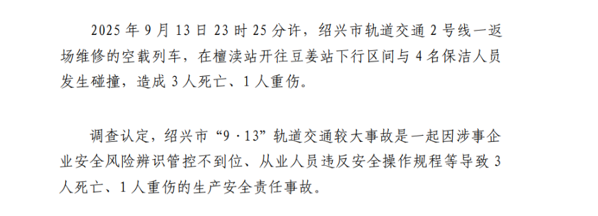 浙江绍兴“9·13”轨道交通2号线列车撞击事故调查报告发布 2025-12-25 18:00 浙江省交通运输厅官网 我要评论0 字号: 点击附件查看报告详情 责任编辑:王逸群 微笑 流汗 难过 羡慕 愤怒 流泪 复制网址 打印 收藏 分享到: 0
