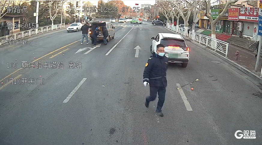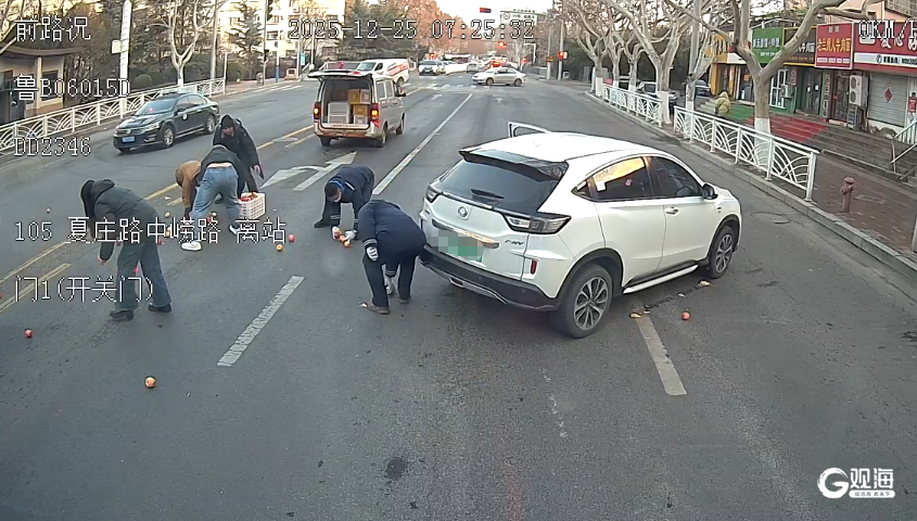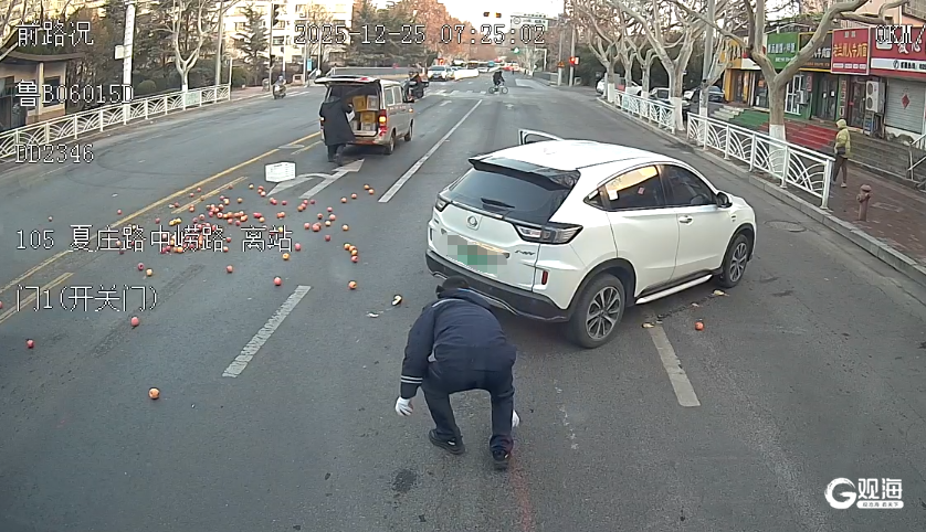 12月25日清晨,青岛街头寒意袭人。在北崂路口,一个突发的小意外,却迅速汇聚成一股暖流。一辆面包车行驶途中,后备箱意外弹开,满载的苹果倾泻而下,散落覆盖三条车道。正当车主一筹莫展时,青岛城运控股公交集团李沧巴士公司105路驾驶员王鹏果断出手,随后多名热心市民相继加入,共同守护了这一地“丰收”。