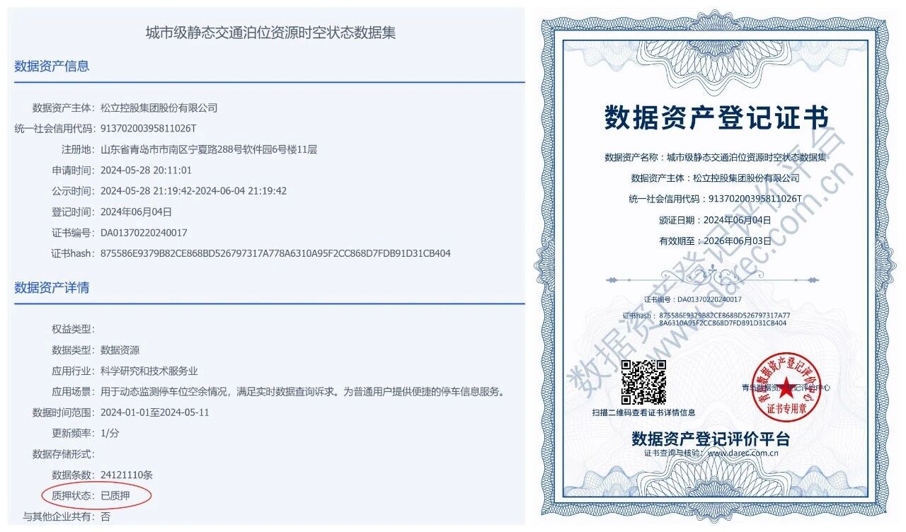 青岛日报社/观海新闻12月27日讯 近日,依托青岛数据集团所属青岛数据资产登记评价中心提供的专业协同服务,青岛融资担保集团联合青岛农商银行成功落地全市首笔“银担企”数据资产质押融资业务,为国家级专精特新“小巨人”企业——松立控股集团股份有限公司提供200万元融资支持,助力企业深耕智慧停车赛道,加速技术迭代与项目拓展。这一突破性实践,不仅破解了中小企业“轻资产、融资难”的行业痛点,更标志着青岛在数据要素市场化配置改革中迈出关键一步,为全国数据资产质押融资模式创新提供了可复制、可推广的“青岛样本”。