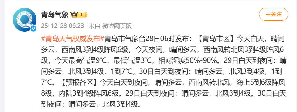 青岛日报社/观海新闻12月28日讯 观海新闻从“青岛气象”获悉,青岛市气象台28日06时发布:【青岛市区】今天白天,晴间多云,西南风3到4级阵风6级,今天夜间,晴间多云,西南风转北风3到4级阵风6级,今天最高气温9℃,最低气温3℃,相对湿度50%-90%。29日白天到夜间:晴间多云,北风3到4级,1到7℃。30日白天到夜间:晴间多云,北风3到4级,1到7℃。