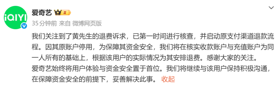 我们关注到了黄先生的退费诉求,已第一时间进行核查,并启动原支付渠道退款流程。因其原账户停用,为保障其资金安全,我们将在核实收款账户与充值账户为同一人所有的基础上,根据该用户的实际情况为其安排退费。感谢大家的关注。