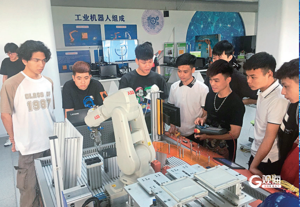 中职学校“职教出海”没有固定的范式可以遵循,青岛的中职学校也在探索、创新中寻求突破。2023年,青岛西海岸新区中德应用技术学校、越南北宁机电与基建大专学院、海之晨工业装备有限公司三方牵手,合作共建墨子工匠学院。“墨子工匠学院是学校重点打造的‘职教出海’品牌,主要以‘中文+职业技能+数字’为路径,开展先进制造业、新一代信息技术、现代服务业等领域的职业技能培训认证、学历培养、师资培训、文化交流,培养国际化人才和中资企业急需的境外本土技术技能人才。”该校能力中心主任匡洁表示。此前,已有10名越南学生和2名越南教师来青完成了工业机器人、企业课程等培训。