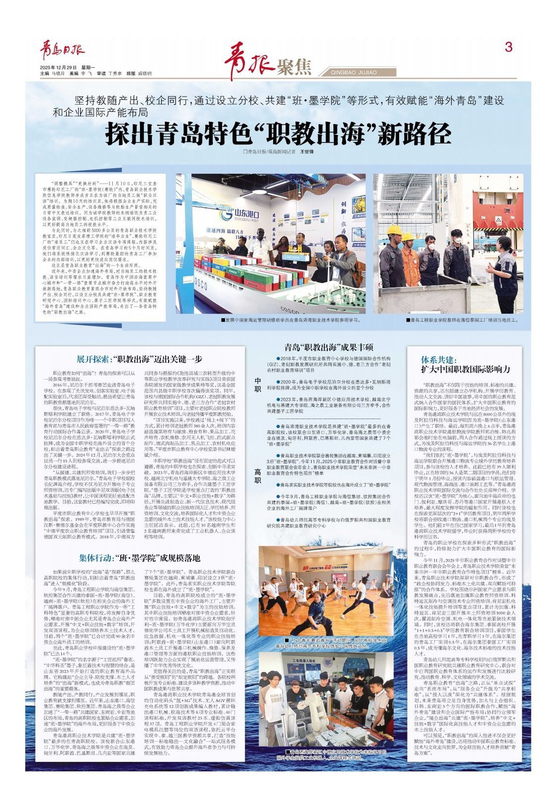 ●青岛职业技术学院联合赛轮集团在越南、柬埔寨、印尼设立3所“班·墨学院”;今年11月,2025中非职业教育合作对话暨中非职业教育联合会年会上,青岛职业技术学院荣登“未来非洲—中非职业教育合作特色项目”榜单