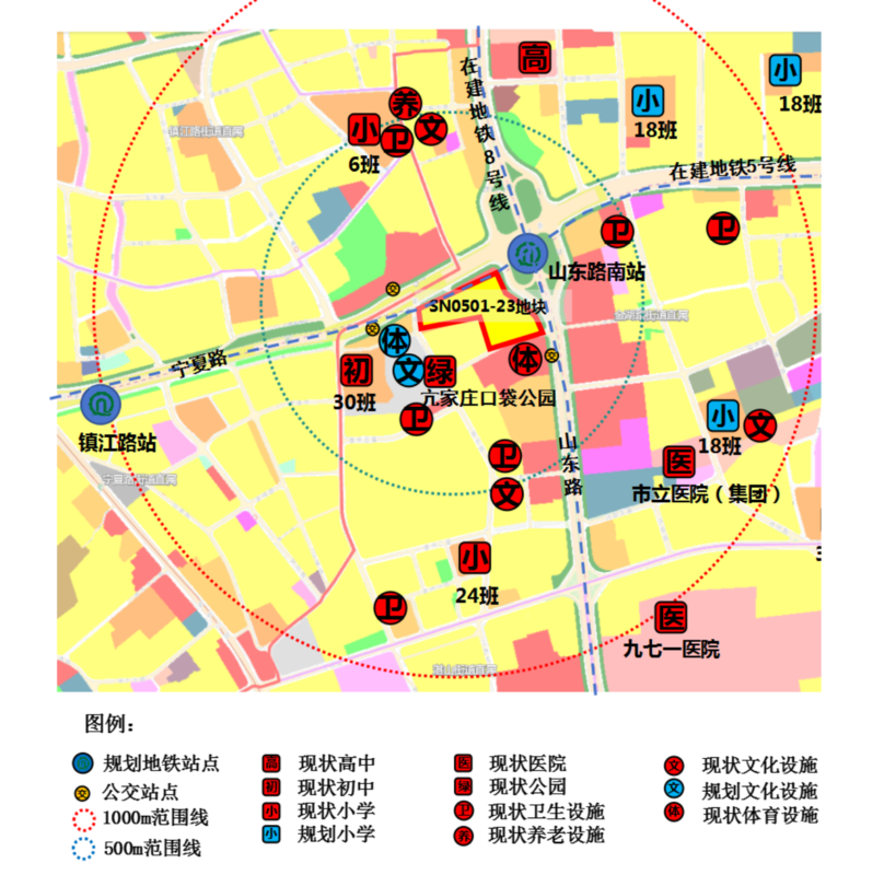 该地块周边公服配套完善,现状周边有在建地铁5号线 、8号线澳柯玛桥站、镇江路站;公交宁夏路镇江路站、山东路宁夏路站等。周边教育有超银中学、镇江路小学、超银小学等,医疗卫生有市立医院(集团)徐州路院区、九七一医院、社区卫生服务站等;规划周边有3所小学。周边文体设施包括国奥击剑馆、新媒体基地;规划周边有社区文化体育设施。城市公园绿地有亢家庄口袋公园等。