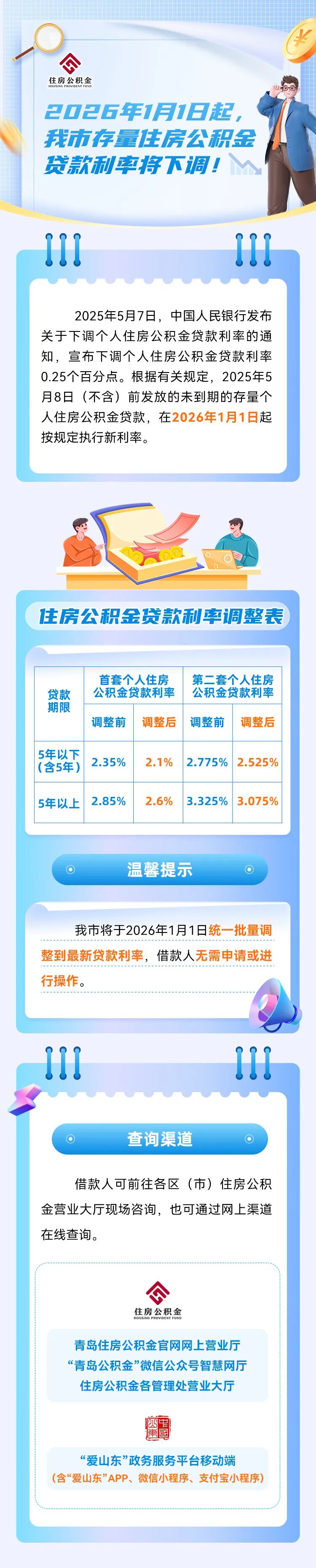 2026年1月1日起,青岛存量住房公积金贷款利率将下调 2025-12-29 19:25 青岛公积金 我要评论0 字号: 青岛市住房公积金管理中心 发布最新消息 月供降低,无需申请! 我市存量住房公积金贷款利率将下调 责任编辑:程雪涵 微笑 流汗 难过 羡慕 愤怒 流泪 复制网址 打印 收藏 分享到: 0