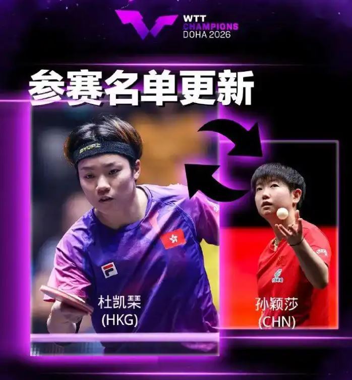 新华社北京12月29日电 世界乒乓球职业大联盟(WTT)29日宣布,中国队选手孙颖莎退出2026年WTT多哈冠军赛,中国香港队运动员杜凯琹递补参赛。