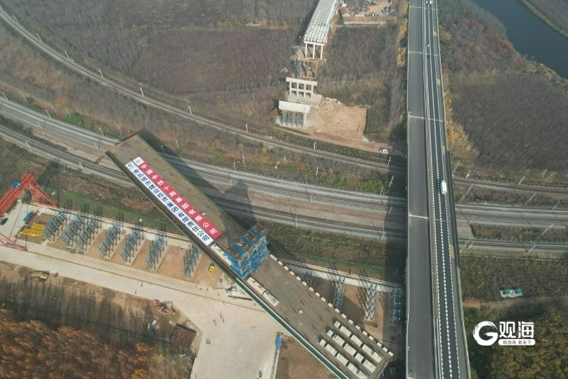 上跨胶济、胶新铁路桥是全省最大不等跨T构钢箱梁涉铁转体桥,创新采用BIM技术全程模拟与毫米级精准转体工艺,确保了重达2万吨的桥梁在铁路“天窗期”内一次转体成功,打通了全线贯通的“最后一公里”。