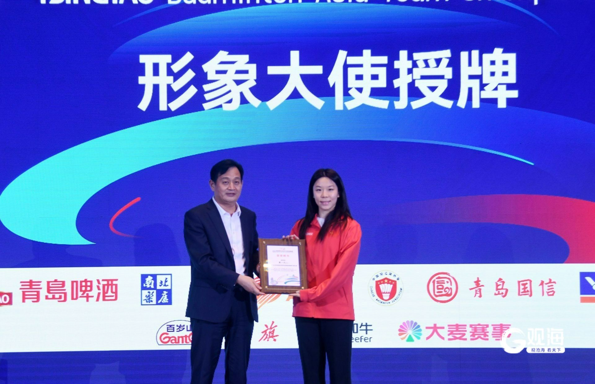 启动仪式现场,巴黎奥运会女双冠军贾一凡被授予“2026年青岛啤酒亚洲羽毛球团体锦标赛形象大使”称号,青岛市政府副市长赵胜村为其授牌。