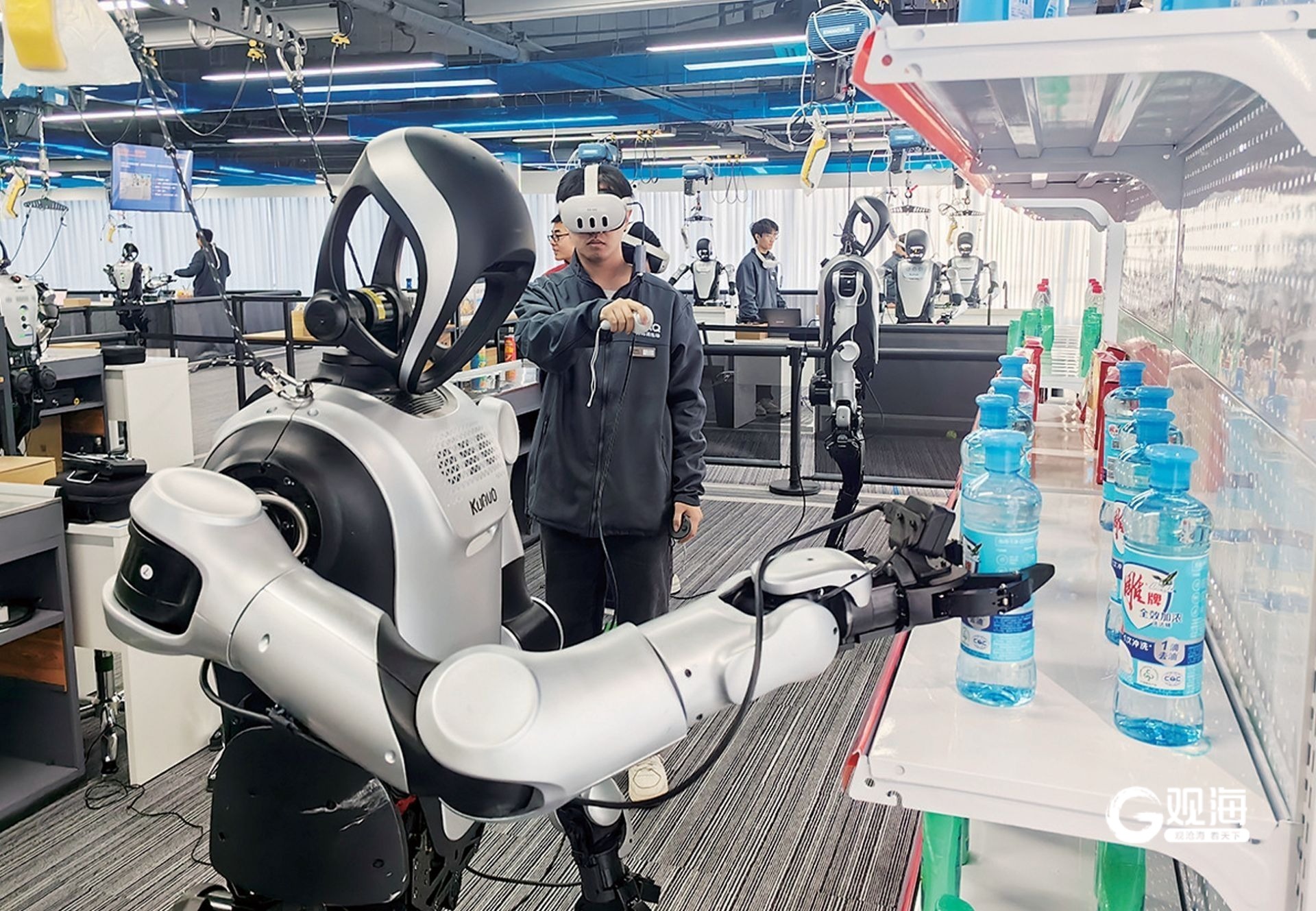 数据采集工位上,工作人员遥控机器人开展货物抓取训练。 邢志峰 摄