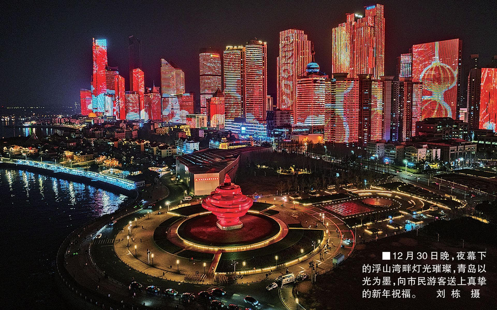 12月30日晚,夜幕下的浮山湾畔灯光璀璨,青岛以光为墨,向市民游客送上真挚的新年祝福。 刘栋 摄