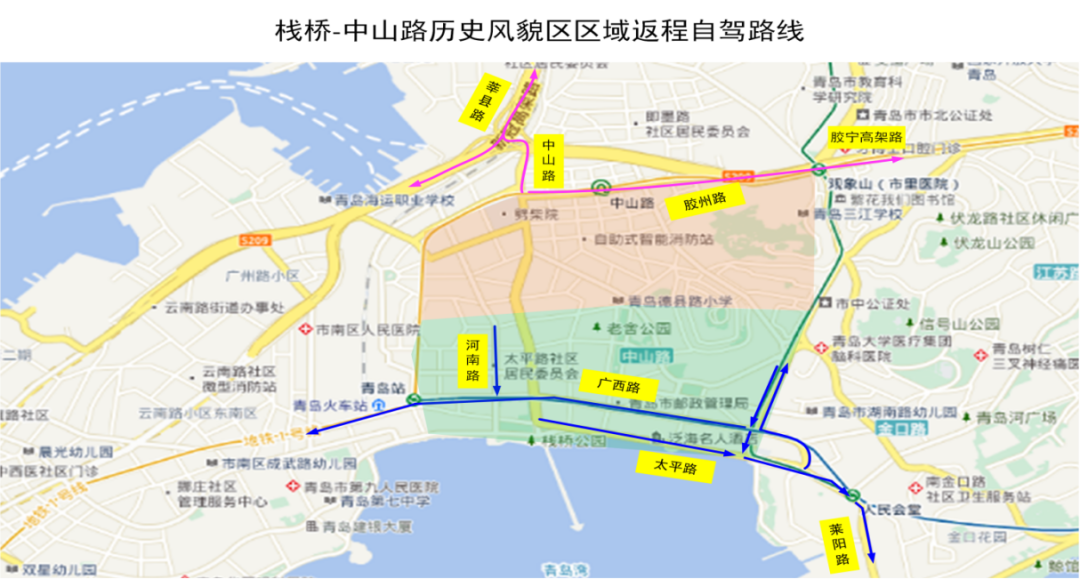 (2)中山路历史风貌区北侧区域,向东驶离的车辆,请沿胶州路、胶宁高架绕行;向西驶离的车辆,请沿中山路、沧口路、莘县路绕行。