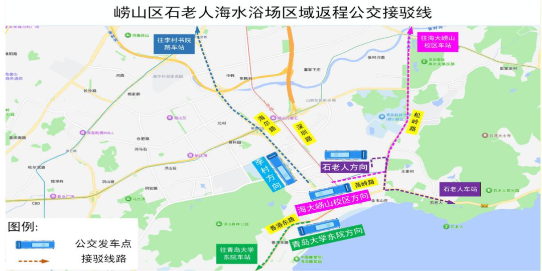 5.崂山区苗岭路深圳路车站(苗岭路地铁站D口)发车点,运行苗岭路地铁站至海大崂山校区方向(3辆车):发车后沿382路走向运行至海大崂山校区车站止,沿途停靠既有车站。