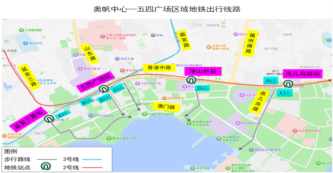 (1)五四广场站(2、3号线),经C口出站,建议沿香港中路南侧向东步行至市政府对面后再向南经五四广场北广场至五四广场南广场或继续前行至奥帆中心;经D口、E口出站,建议沿山东路西侧向南步行至东海西路后至五四广场或继续前行至奥帆中心。