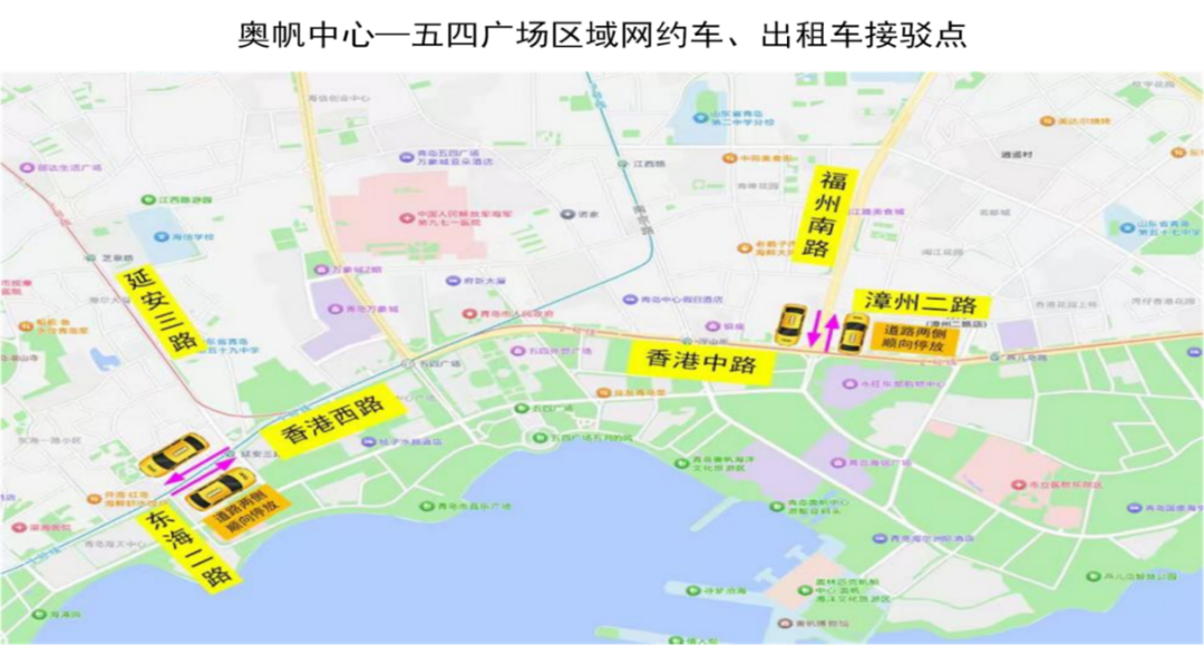 设置出租车、网约车接驳区域3处,分别为梅岭东路美高梅酒店南侧停车场(美高梅酒店入口对面)、青岛静态交通金家岭立交停车场、云岭路青岛大剧院,市民游客可步行前往乘车。