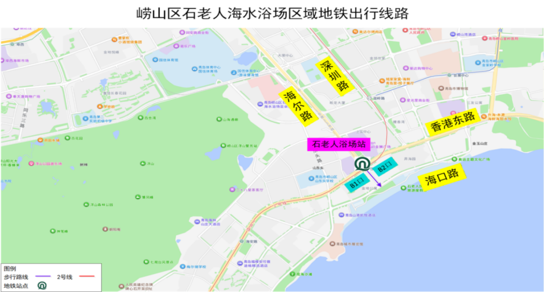 石老人浴场站(2号线),建议经B1口、B2口出站。