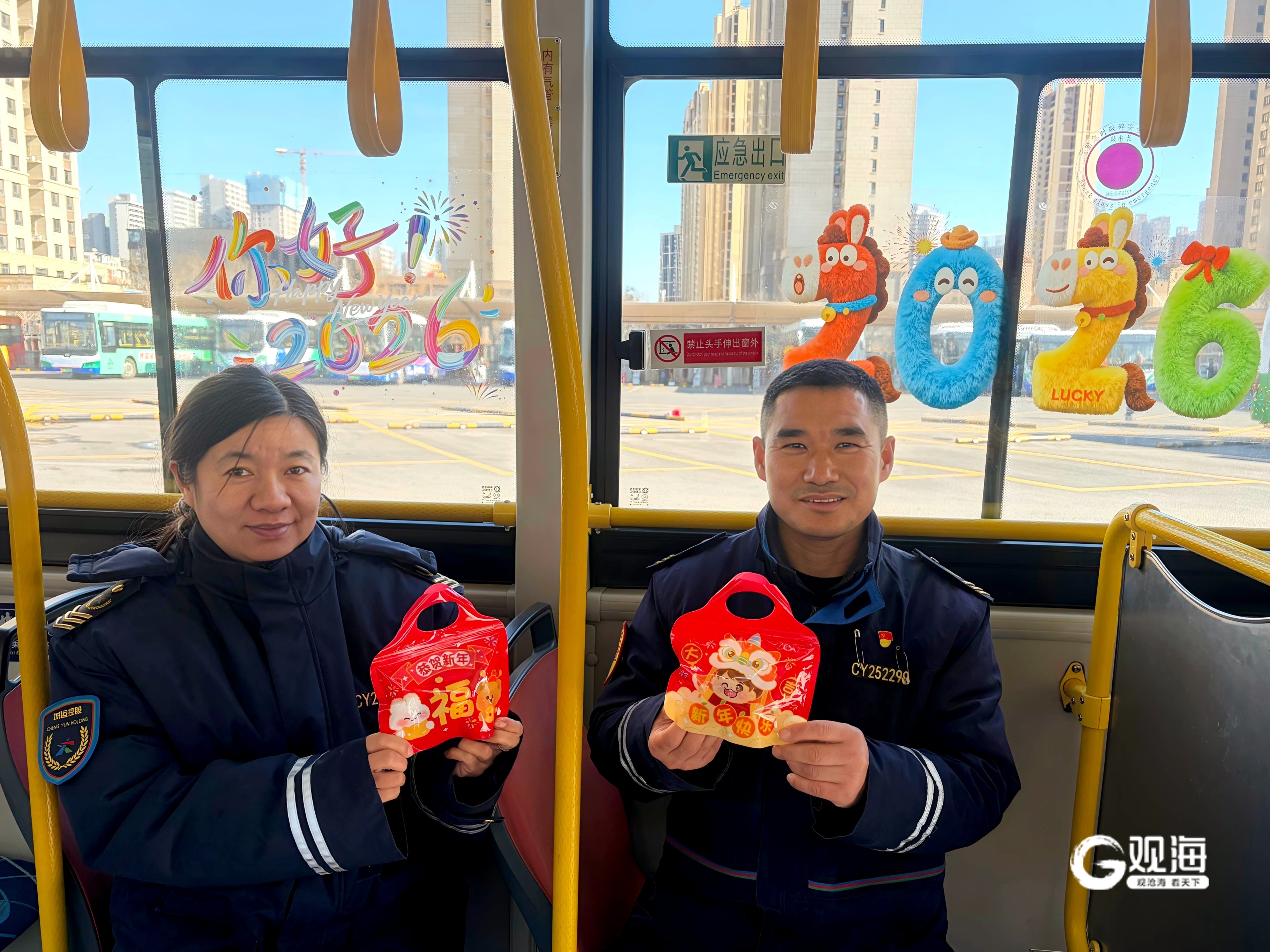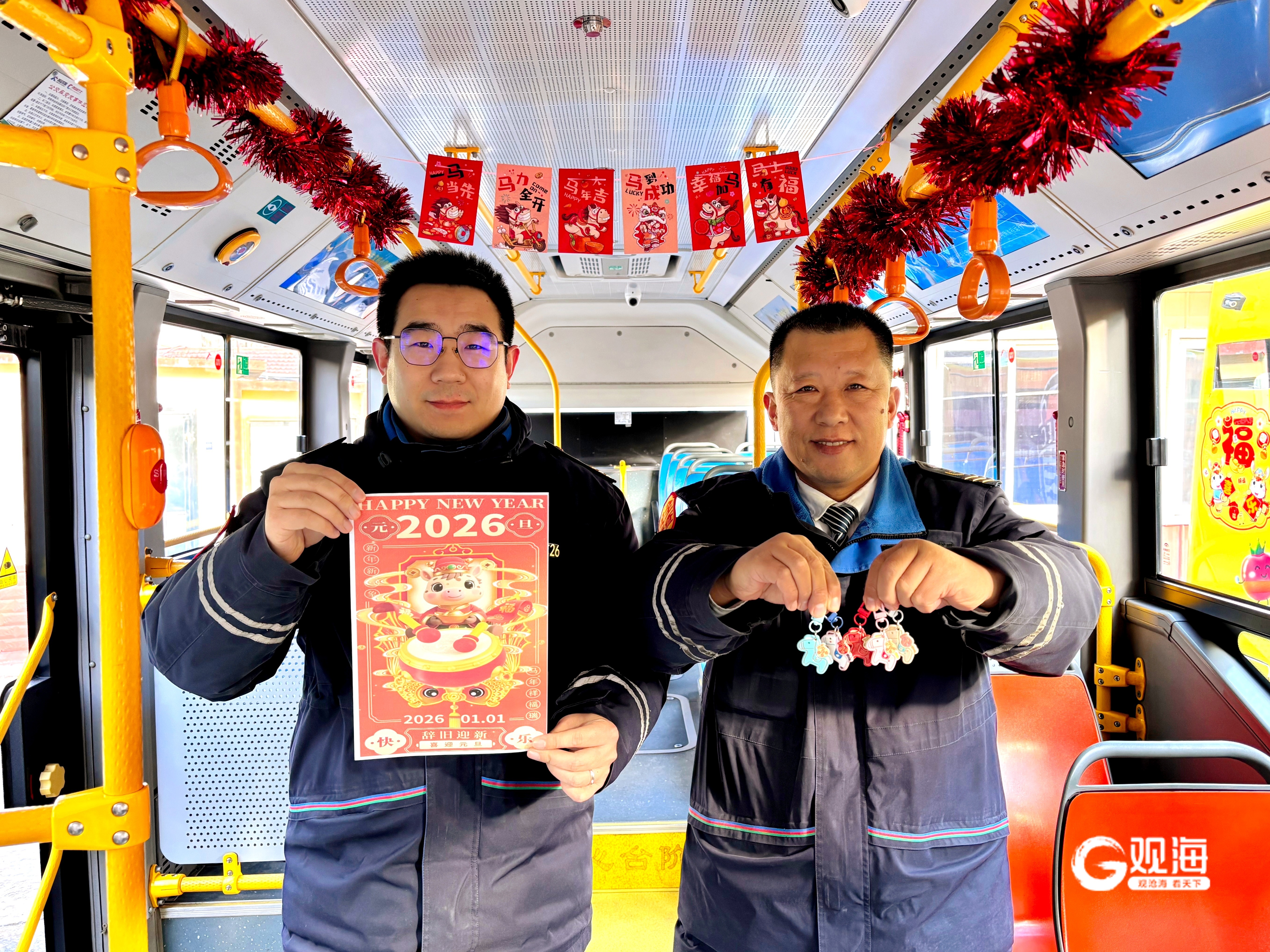 126路驾驶员徐正岩则把车厢打造成了“视听双享”的温馨空间。车窗上贴着毛茸感的“2026”数字图案和元旦主题贴画,车辆到站时还会响起“青岛巴士祝您元旦快乐”的专属语音。更让乘客惊喜的是,徐师傅还自费准备了“惊喜盲盒”,随机赠送给乘客,里面可能是钥匙扣、窗花,也可能是一句手写祝福。